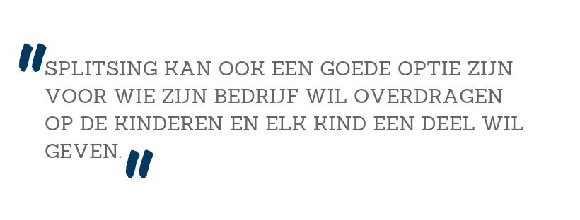 “Als je bedrijf jarenlang groeit, kan je onderneming moeilijker bestuurbaar worden. Dat kan zijn vanwege de omvang, maar ook omdat er verschillende activiteiten zijn. Splitsing kan het managen van de verschillende onderdelen dan makkelijker maken. Veel ondernemers willen hun bedrijf splitsen om zo de risico’s te spreiden: is één van de bv’s verlieslatend of gaat deze zelfs failliet, dan is de kans groter dat de andere bv’s in de holding gewoon kunnen blijven draaien. Splitsing kan ook een goede optie zijn voor wie zijn bedrijf wil overdragen op de kinderen en elk kind een deel ervan wil geven. Soms is splitsen een noodzaak, bijvoorbeeld bij ruzie tussen de aandeelhouders.”