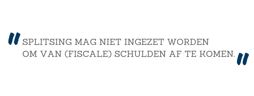 Roel: “Splitsen mag alleen als je daar een bedrijfseconomische reden voor hebt. Denk daarbij aan een herstructurering, verzelfstandiging van activiteiten of een overdracht. De inspecteur van de belastingdienst kijkt daar kritisch naar, want een splitsing mag niet ingezet worden om van (fiscale) schulden af te komen.”